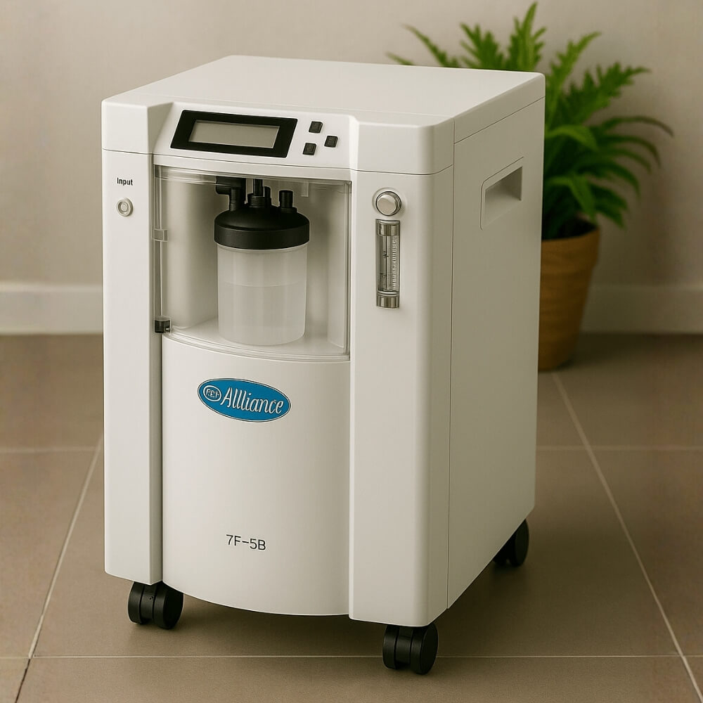 AllTimes 7F-5B 5 Litre oksijen konsantratörü, evde bakım ve sağlık merkezlerinde uzun süreli oksijen tedavisi ihtiyacı olan hastalar için geliştirilmiş, güvenilir ve yüksek performanslı bir ev tipi oksijen makinesidir. %93 ±3 oksijen saflığı ile sürekli ve stabil oksijen akışı sağlayarak solunum desteğini güvenle sürdürür.
